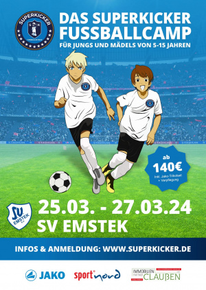 (bm) Der SV Emstek veranstaltet wie im vergangenen Jahr in Kooperation mit der SUPERKICKER-Fußballschule in den Osterferien vom 25.03. bis zum 27.03. ein dreitägiges Fußballcamp auf dem Kreisplatz an der Oberschule Ostlandstraße. Fußballbegeisterte Jungs und Mädchen zwischen 5 und 15 Jahren sind eingeladen, egal ob „Profikicker“ oder Freizeitspieler, dabei zu sein.