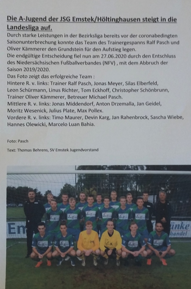 A Junioren JSG 1: Spielberichten Die A Jugend der JSG Emstek/Höltinghausen steigt in die Landesliga auf Die A Jugend der JSG Emstek/Höltinghausen steigt in die Landesliga auf. Erstellt: 02. Juli 2020 Vorheriger Beitrag: 1. A-Jugend der JSG Em/Be/Hö erreicht Vizemeisterschaft in der Landesliga. Zurück Nächster Beitrag: Emstek/Höltinghausen nutzt den Heimvorteil Weiter